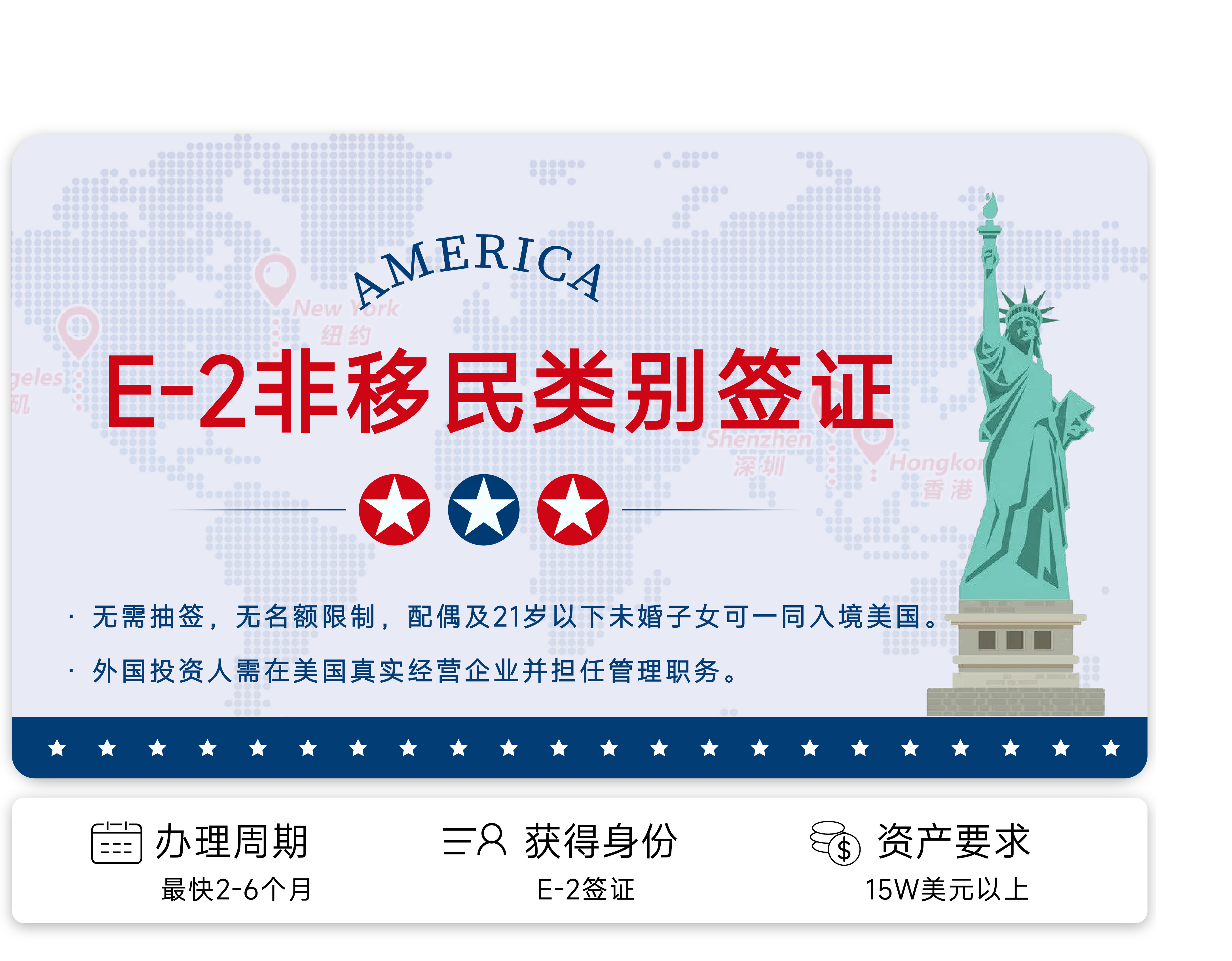 美国E-2签证E-2签证是美国非移民签证类别之一,允许与美国有通商航海条约国家的国民,通过在美国进行实质性投资的方式进入美国。E-2签证持有者的配偶可以申请工卡在美国工作,21周岁以下的未成年子女可以随同申请,并入读当地公立学校。131-6803-9870